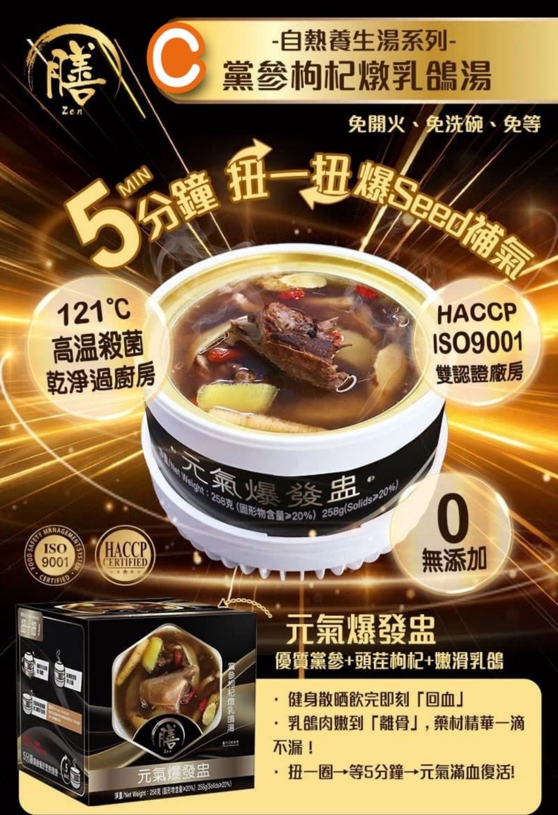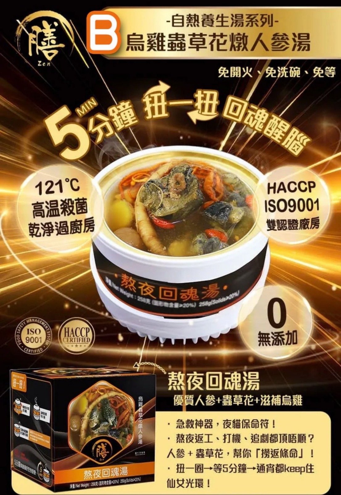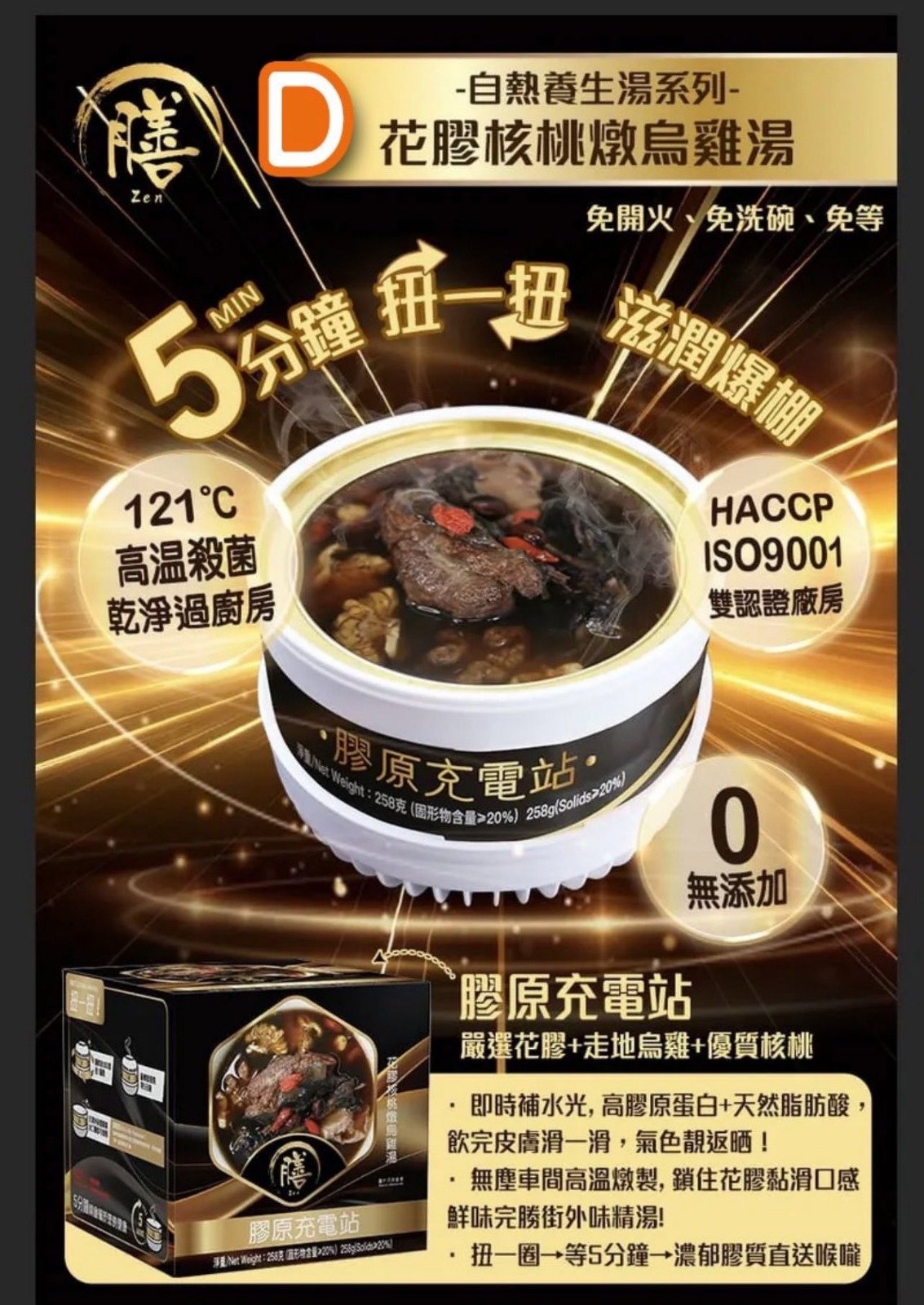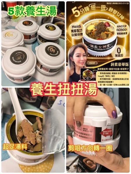 扭扭【膳】自熱養生湯 (1套5個) 5款湯各有特色,不同味道,湯料十足,即扭即飲,非常方便,睇下直播介紹就知有幾好飲🤤 !5分鐘極速滋補💨 OT到面青🥴、手軟腳軟💤?Heidi(陳慧玲)養生湯急救隊到🏃♀️💨 ✨5款爆款自熱湯💫扭一扭秒變女神 A. 【姬松茸羊肚菌素湯】🌱素食界仙女 → 零負擔菌菇盛宴🥣減脂期都能狂飲3碗 B. 【烏雞蟲草花人參湯】🌙熬夜救世主 → 人參+蟲草雙重buff📺通宵打機/追劇必備🎮 C. 【黨蔘枸杞乳鴿湯】⚡元氣充電寶 → 黨蔘補氣+枸杞亮眼☕️飲完即時醒過冰美式 D. 【花膠核桃燉烏雞湯】💖膠原彈彈彈 → 花膠x核桃x烏雞✨飲完成塊面發光!連指甲都粉嫩💅 (E) 潤肺潤膚養顏靚靚湯 —— 竹笙土雞馬蹄燉海椰 🍵✨ 🏆五星級安心保障✅ 🔹 數十萬呎無塵工廠🏭 HACCP+ISO9001雙認證📜 🔹 121°C太空級滅菌🚀 常溫存放超方便 🔹 自熱黑科技🔋 扭開等5分鐘⏳=老火湯8小時 💯懶人養生革命💥 🏙️朝早趕工 🌃深夜餓魔 🎮宅家廢青 👉🏻一扭即飲=氣色+元氣+顏值三連跳🌟 ✅ 好飲 ✅ 健康 ✅ 有營 ✅ 抵飲 #自熱湯界天花板 (E) 潤肺潤膚養顏靚靚湯 —— 竹笙土雞馬蹄燉海椰 🍵✨ 都市生活節奏急促,冷氣房同戶外溫差大,一冷一熱令肺部乾燥、肌膚暗淡?由Heidi Chan(陳慧玲)帶領專業研發團隊,精心打造「潤肺潤膚養顏靚靚湯」,嚴選竹笙、土雞、馬蹄、蓮子、百合、海底椰六大滋補食材,慢火燉製,湯底清甜滋潤,為你潤肺養顏、提升氣色,輕鬆應對都市冷熱挑戰! 💚 Heidi Chan —— 健康美顏嘅都市守護者 Heidi 深知都市人因冷氣環境同溫差大容易感到不適,帶領研發團隊特別調配呢款靚湯,精選優質食材,細心燉煮,確保每碗湯都帶來均衡營養同舒適滋潤,幫你由內到外散發健康光彩,活力迎接每一天! 產品特點 : ✨六大天然食材,滋潤養生 ✨土雞:優質蛋白,溫和滋補,增強體力,湯底鮮美濃郁。 ✨竹笙:低脂高纖,滋潤肺部,口感爽滑,增添清甜風味。 ✨馬蹄:清甜爽脆,帶來清新口感,提升湯品層次。 ✨蓮子:養心安神,補脾益腎,改善氣色,增添紅潤光澤。 ✨百合:潤肺養陰,清熱安神,舒緩壓力,助眠更香。 ✨海底椰:滋陰潤肺,生津止渴,特別適合乾燥天氣,保持喉嚨舒適。 ✨都市養生新選擇,潤肺又養顏 喺冷氣房同炎熱戶外之間頻繁轉換,肺部同肌膚容易變得乾燥無光澤。「潤肺潤膚養顏靚靚湯」專為忙碌都市人設計,低脂高營養,湯底清甜不膩,飲落溫暖舒適,幫你滋潤肺部、養出水潤肌膚,時刻保持健康同靚麗! ✨100%天然食材:無人工色素或防腐劑,純粹健康。 ✨男女皆宜:溫和滋補,適合全家享用,尤其適合乾燥炎熱季節。 ✨養顏又養生:一碗湯滋潤肌膚、強健肺部、安神助眠,全面提升活力同氣色。 ✨專業品質保證:由數十萬呎專業廠房生產,通過HACCP及ISO9001認證,採用121°C高溫高壓殺菌技術,無塵環境,安全衛生有保證! 🔥 三大場景,點飲最聰明? 🔹朝九晚九OL:代替晚餐高熱量外賣,一包熱湯+半碗雜糧飯,飽住瘦3斤! 🔹健身控體族:運動後補充植物蛋白質,腰果營養直擊肌肉修復! 🔹熬夜追劇黨:蟲草花深夜修護模式啟動,聽朝面色唔會灰冚冚~ 產品容量 : 🔹258G/1盒 預計到貨日:11月中旬