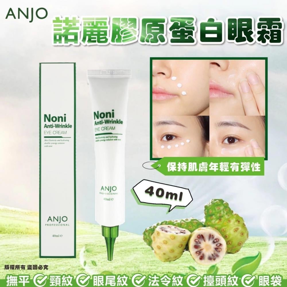 韓國🇰🇷ANJO諾麗膠原蛋白眼霜40ml ✴️諾麗果是上帝的禮物,其特殊的抗衰老功效可讓您的肌膚重現年輕光彩。 ✴️中和有害氧自由基,保持肌膚健康。 ✴️防止皺紋形成,保持肌膚年輕有彈性。 ✴️諾麗果和膠原蛋白是防止皮膚老化的絕佳夥伴。 ✴️含有超級食品複合物,可使肌膚恢復活力。 ✴️彈性和水分的協同作用,打造水潤飽滿的肌膚。 ✴️諾麗雜質檢查測試已完成。 免打肉毒~輕鬆擁有完美眼眸超亮眼 神奇的撫平皺紋 不管是 ✅頸紋 ✅眼尾紋 ✅法令紋 ✅擡頭紋 ✅眼袋 不讓歲月停留在臉上~ 成分超天然~ 使用方法: 使用爽膚水或精華液後,取適量塗抹於眼周,輕輕拍打幫助吸收。